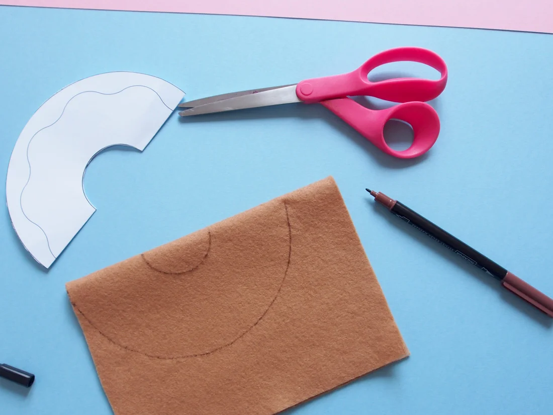 1. Print out the donut template above. First cut out the large circle and fold it in half down the middle to cut out the centre. Fold your beige felt in half and lay the template over the top with the template and the felt's folds matching up. Cut out the donut shape in the beige felt.