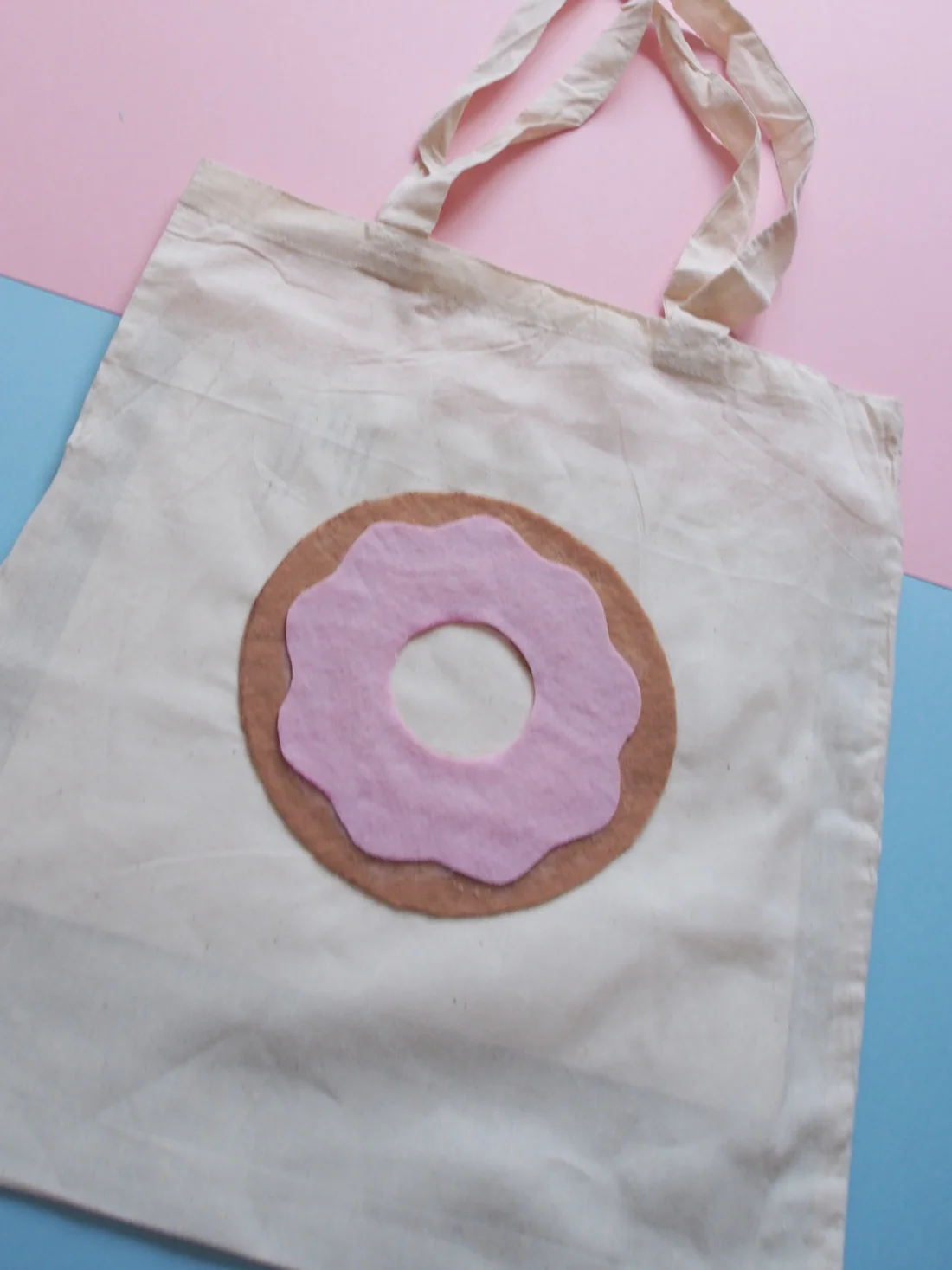 3. Apply fabric glue to the donut and stick it down in the centre of the tote bag. Allow it to dry before sticking the pink icing on over the top.